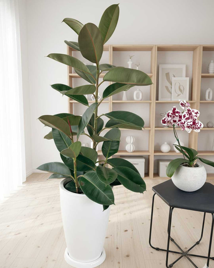 El Ficus Elastica es la planta favorita de diseñadores por la exuberante belleza de sus hojas grades, lisas y oscuras.