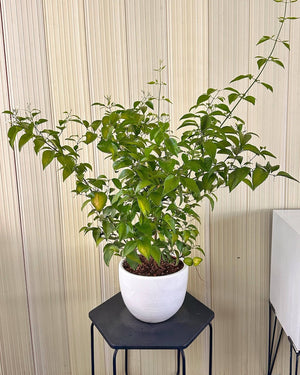 El Jazmin limón es una planta trepadora de exterior y de hoja perenne. Es apreciada por sus hermosas flores blancas, su amplio periodo de floración y sus flores perfumadas y color limón.