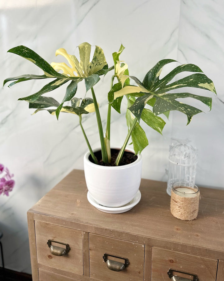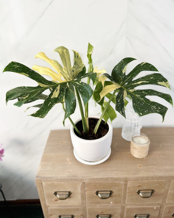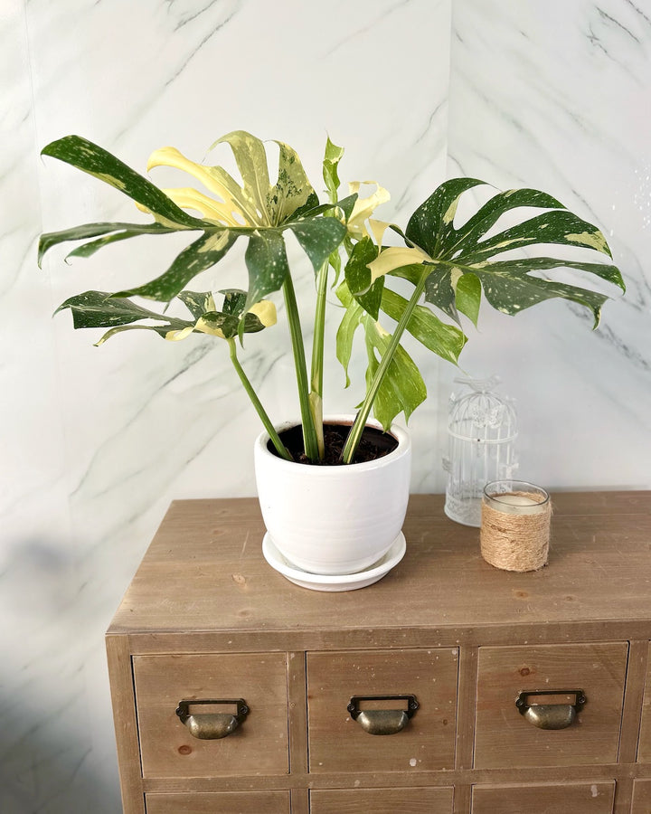 El Monstera variegada Thai es una planta de interior de hojas más grandes, con origen tropical, esta planta solo necesitará de mucha humedad y un poco de amor para llenar tu hogar de aire limpio.